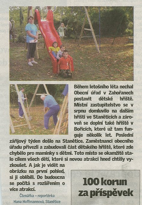 Během letošního léta nechal Obecní úřad v Zahořanech postavit dětské hřiště. Místní zastupitelstvo se v srpnu domluvilo na dalším hřišti ve Staněticích a zároveň se doplní také hřiště v Bořicích, které už tam funguje několik let. Poslední zářiový týden došlo na Stanětice. Zaměstnanci obecního úřadu přivezli a zabudovali část dětského hřiště, které zde chybělo pro maminky s dětmi. Toto místo se okamžitě stalo cílem všech dětí, které si novou atrakci hned chtěly vyzkoušet. A jak je vidět na obrázku na první pohled, si jí oblíbili. Do budoucna se počítá s rozšířením o více atrakcí. Čtenářka reportérka - Hana Hoffmannová - Domažlický deník |