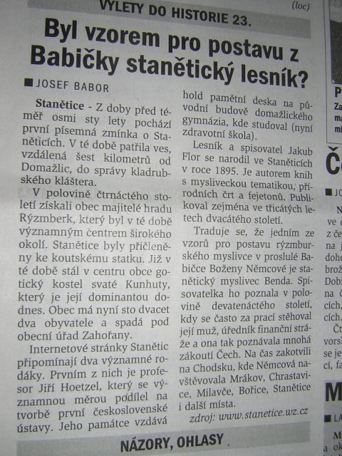 Stanětice - Z doby před téměř osmi sty lety pochází první písemná zmínka o Staněticích. V té době patřila ves, vzdálená šest kilometrů od Domažlic, do správy kladrubského kláštera. V polovině čtrnáctého století získali obec majitelé hradu Rýzmberk, který byl v té době významným centrem širokého okolí. Stanětice byly přičleněny ke koutskému statku. Již v té době stál v centru obce gotický kostel svaté Kunhuty, který je její dominantou dodnes. Obec má nyní sto dvacet dva obyvatele a spadá pod obec Zahořany. Internetové stránky Stanětic připomínají dva významné rodáky. První z nich je profesor Jiří Hoetzel, který se významnou měrou podílel na tvorbě první československé ústavy. Jeho památce vzdává hold pamětní deska na původní budově domažlického gymnázia, kde studoval (nyní zdravotní škola). Lesník a spisovatel Jakub Flor se narodil ve Staněticích v roce 1895. Je autorem knih s mysliveckou tématikou; přírodních črt a fejetonů. Publikoval zejména ve třicátých letech dvacátého století. Traduje se, že jedním ze vzorů pro postavu rýzmburského myslivce v proslulé Babičce Boženy Němcové je stanětický myslivec Benda. Spisovatelka ho poznala v polovině devatenáctého století, kdy se často za prací stěhoval její muž, úředník finanční stráže a ona tak poznávala mnohá zákoutí Čech. Na čas zakotvili na Chodsku, kde Němcová navštěvovala Mrákov, Chrastavice, Milavče, Bořice, Stanětice i další místa. zdroj: www.stanetice.cz Josef Babor - Domažlický deník |