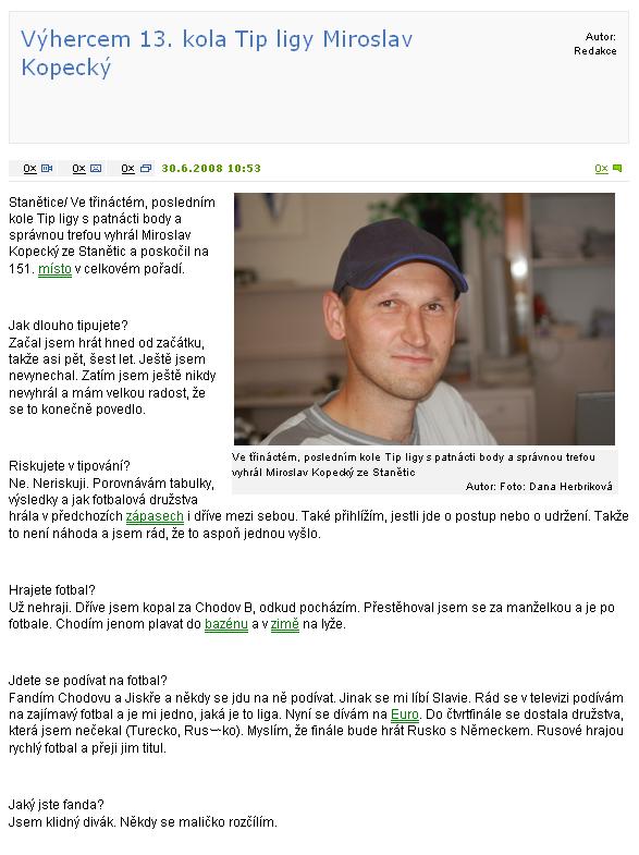 Stanětice/ Ve třináctém, posledním kole Tip ligy s patnácti body a správnou trefou vyhrál Miroslav Kopecký ze Stanětic a poskočil na 151. místo v celkovém pořadí. Jak dlouho tipujete? Začal jsem hrát hned od začátku, takže asi pět, šest let. Ještě jsem nevynechal. Zatím jsem ještě nikdy nevyhrál a mám velkou radost, že se to konečně povedlo. Riskujete v tipování? Ne. Neriskuji. Porovnávám tabulky, výsledky a jak fotbalová družstva hrála v předchozích zápasech i dříve mezi sebou. Také přihlížím, jestli jde o postup nebo o udržení. Takže to není náhoda a jsem rád, že to aspoň jednou vyšlo. Hrajete fotbal? Už nehraji. Dříve jsem kopal za Chodov B, odkud pocházím. Přestěhoval jsem se za manželkou a je po fotbale. Chodím jenom plavat do bazénu a v zimě na lyže. Jdete se podívat na fotbal? Fandím Chodovu a Jiskře a někdy se jdu na ně podívat. Jinak se mi líbí Slavie. Rád se v televizi podívám na zajímavý fotbal a je mi jedno, jaká je to liga. Nyní se dívám na Euro. Do čtvrtfinále se dostala družstva, která jsem nečekal (Turecko, Rus?ko). Myslím, že finále bude hrát Rusko s Německem. Rusové hrajou rychlý fotbal a přeji jim titul. Jaký jste fanda? Jsem klidný divák. Někdy se maličko rozčílím. Domažlický deník |