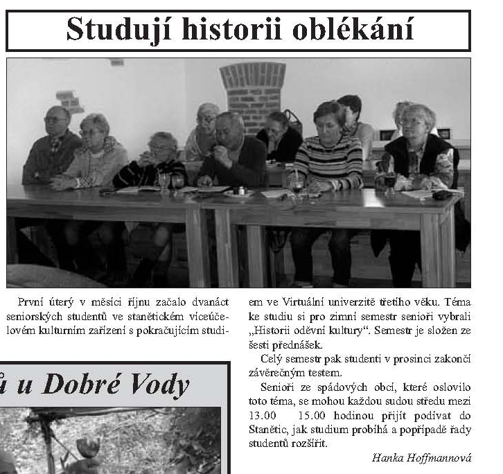 První úterý v měsíci říjnu začalo dvanáct seniorských studentů ve stanětickém víceúčelovém kulturním zařízení s pokračujícím studiem ve Virtuální univerzitě třetího věku. Téma ke studiu si pro zimní semestr senioři vybrali "Historii oděvní kultury". Semestr je složen ze šesti přednášek. Celý semestr pak studenti v prosinci zakončí závěrečným testem. Senioři ze spádových obcí, které oslovilo toto téma, se mohou každou sudou středu mezi 13.00 ? 15.00 hodinou přijít podívat do Stanětic, jak studium probíhá a popřípadě řady studentů rozšířit. Hanka Hoffmannová Kdyňsko 5/2013 |
